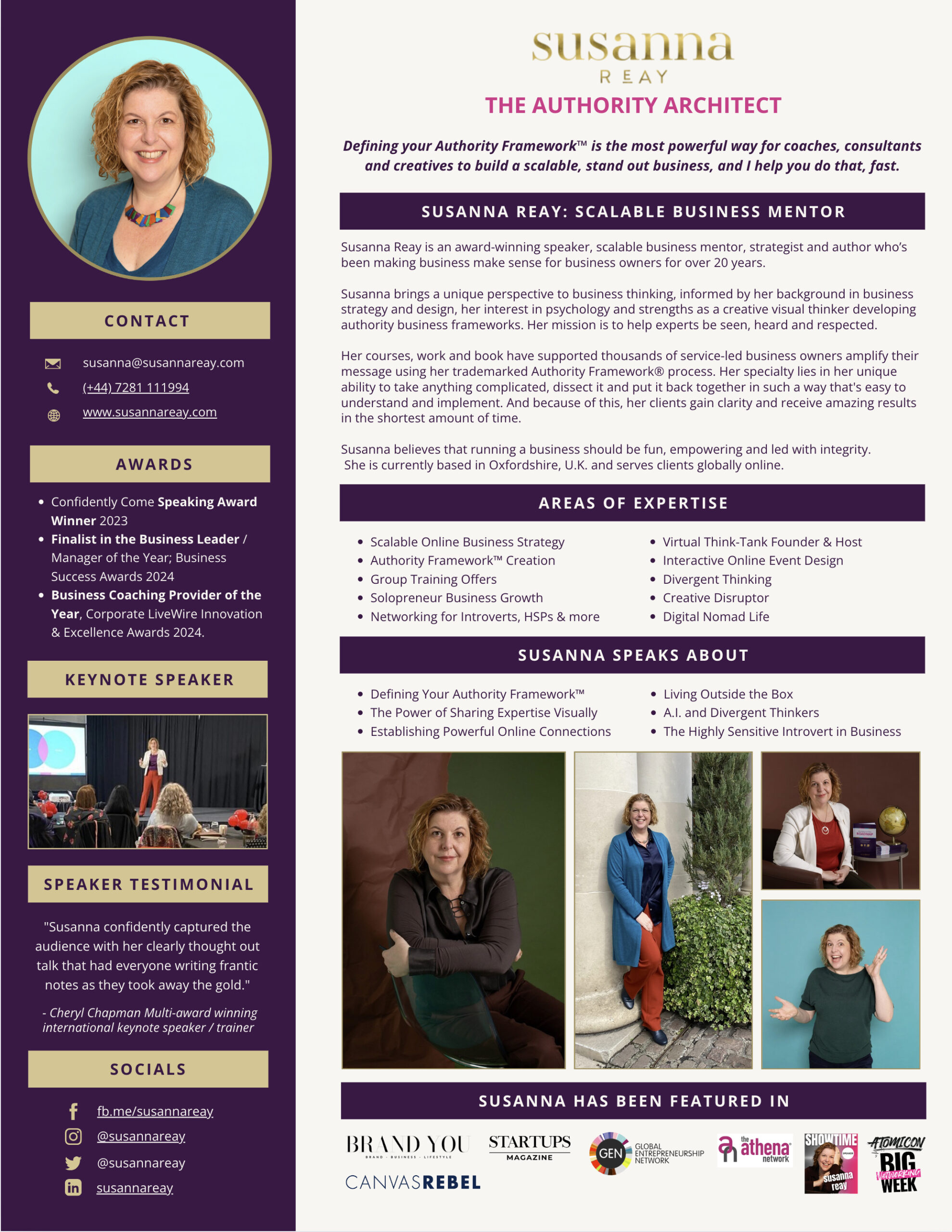 Susanna Reay is a highly respected scalable business mentor, the ‘Authority Think-Tank Summit’ founder, speaker & author who over the last 20 years has mentored entrepreneurs globally to sell their services online. Susanna’s trademarked Authority Frameworks® bring visual focus and clarity out of complex service offers, enabling clients to scale their business with ease. As a divergent thinker, she explores topics with a unique lens, bringing instant insight and clarity.